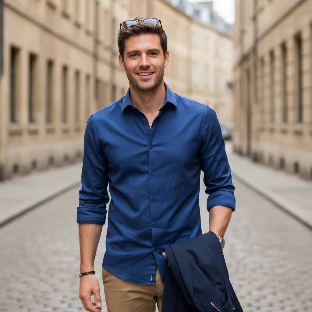 La chemise Jacques™ incarne le savoir-faire et le raffinement à la française. Des finitions précises, un col structuré et des boutons discrets : chaque détail est pensé pour offrir une élégance durable et universelle.